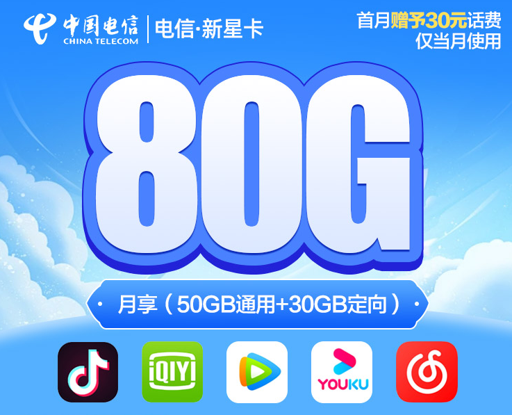定向流量:30GB,适用于爱奇艺、腾讯视频、优酷视频、西瓜视频、抖音短视频、抖音火山版、快手、网易云音乐等应用。