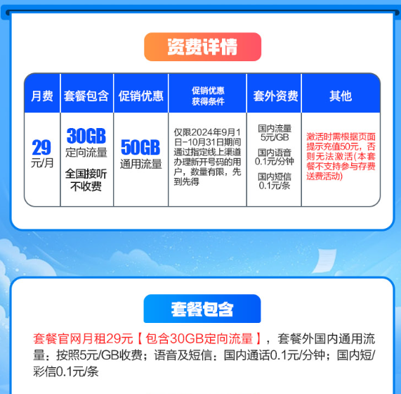 综上所述,电信星卡29元套餐提供了一定的定向流量和可能的额外通用流量,同时包含语音通话和短信服务。用户可根据自身需求和所在地区的促销活动选择合适的套餐版本。在办理前,请务必了解清楚套餐内容、优惠情况和注意事项等相关信息。